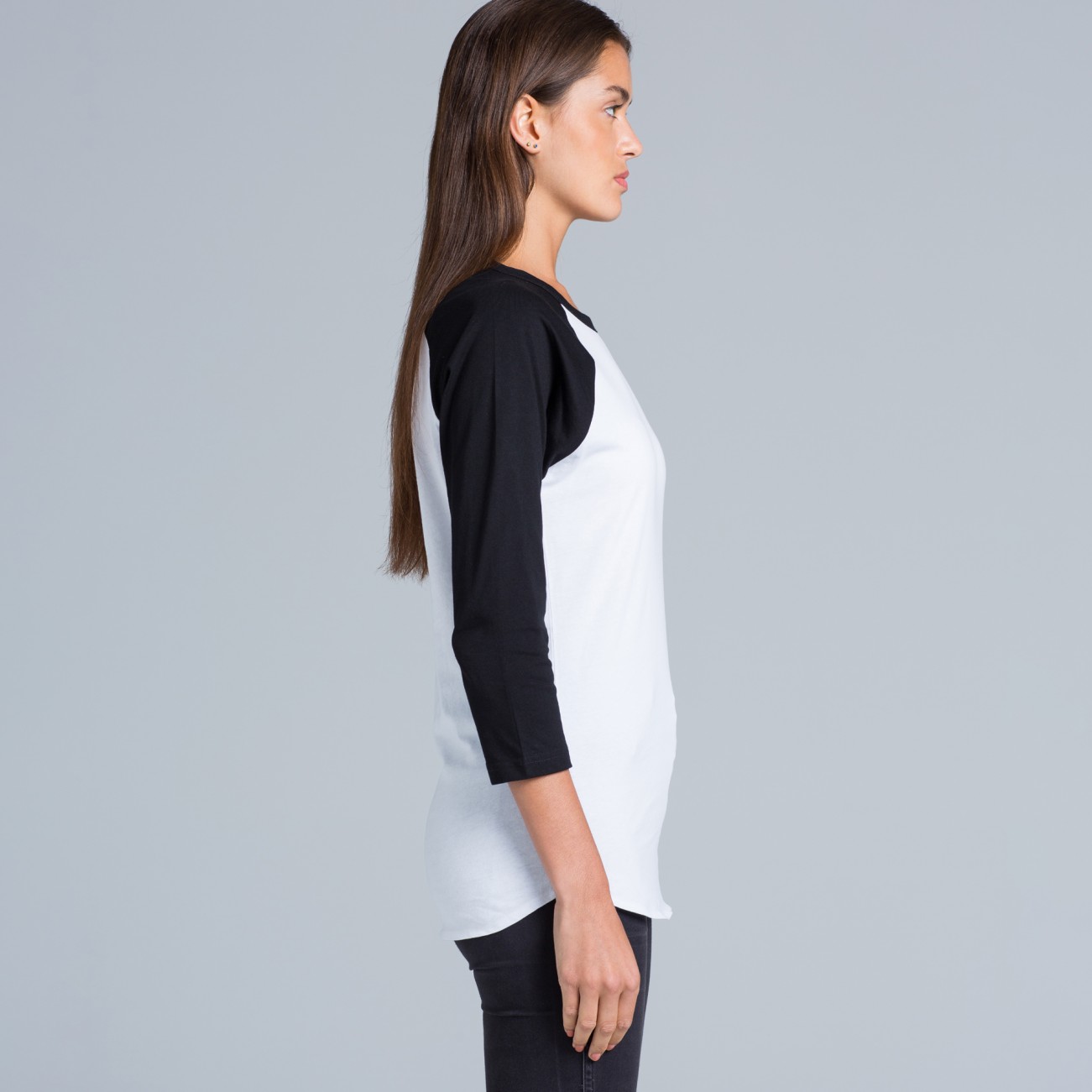 Crew neck, ¾ length raglan sleeves, curved tails
